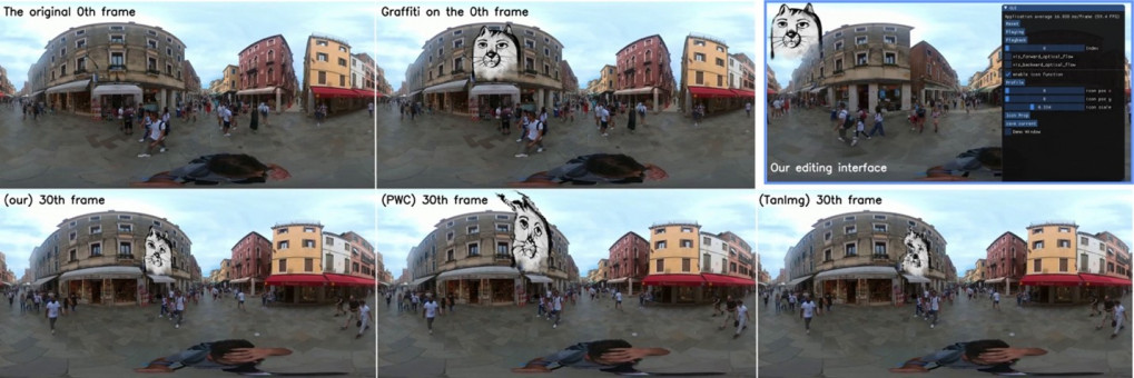 One of the challenges of adding new objects into 360° panoramic environments is that they must maintain their position relative to other parts of the scene as the viewing angle changes and time passes. The way that objects, surfaces and edges appear to move through space is known as “optical flow”. Unfortunately, existing computational methods are often inaccurate when it comes to estimating optical flow in 360° scenes, leading to unnatural movement of objects and loss of immersion. To solve this problem, Dr Zhang and Professor Dodgson’s team have developed a “multi-projection-based” approach of computing optical flow - this combines predictions from multiple single-projection models, and results in 40% more accurate estimations of optical flow in MR panoramic scenes. This approach can be used to track object movement, but also to improve the temporal and spatial consistency of virtual objects edited into MR panoramic videos (Figure 1).