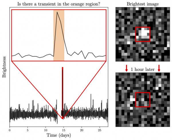 An example event from the Cosmic Cataclysms Zooniverse project. On the left is how the brightness changes over time where the orange-filled zone indicates where the code thinks something interesting happens. The quick rise and fall in brightness is indicative of a fast event. Images of the event as seen by TESS are shown on the right with the event located within the red box. This event is not visible after just one hour (Supplied).